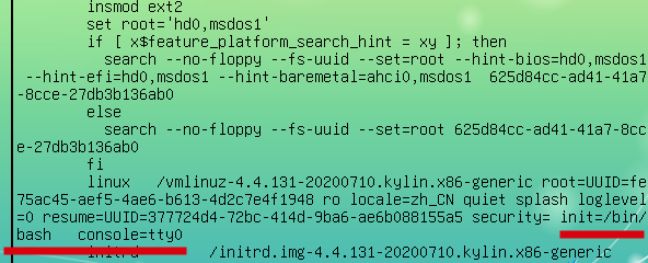 2、飞腾、兆芯、x86等:按向下箭头 往下查找到linux开头的行,在末尾输入 空格 再加一行 init=/bin/bash  console=tty0 ((注意:console前面与init前有空格))然后同时按 ctrl + x (或者按F10)进入