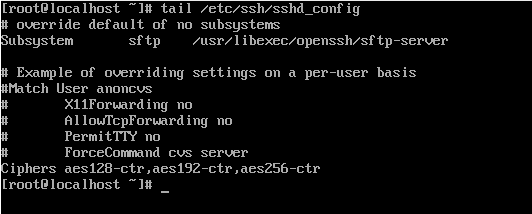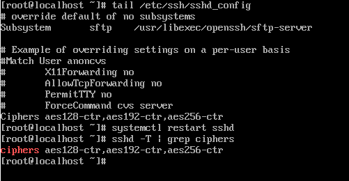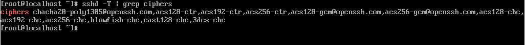 我们可以通过 sshd -T | grep ciphers 查询当前设备支持的算法情况,默认没有特别配置的情况下,查询出来结果如下: