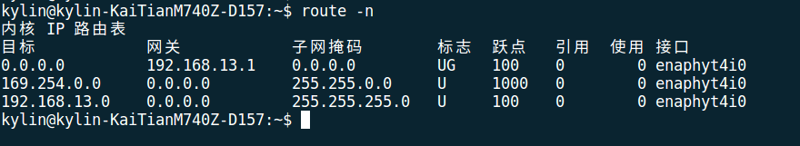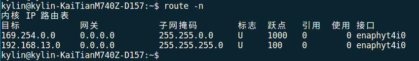 3. 使用 route -n或者netstat -rn:查看网关和路由信息,对比正常机器是否正常,发现没有默认路由(如下图所示:),但网卡配置上已经有网关地址了。