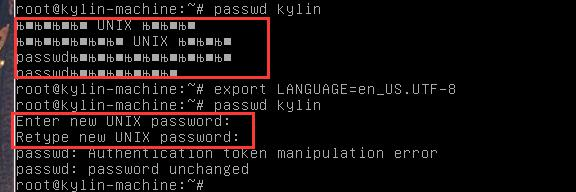 如上图所示,显示了乱码,可以直接忽略,输入两次密码即可修改成功;也可以按下图的方法,输入“export LANGUAGE=en_UTF-8”修正字符后再进行密码修改,如下图所示: