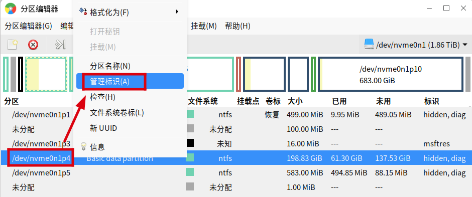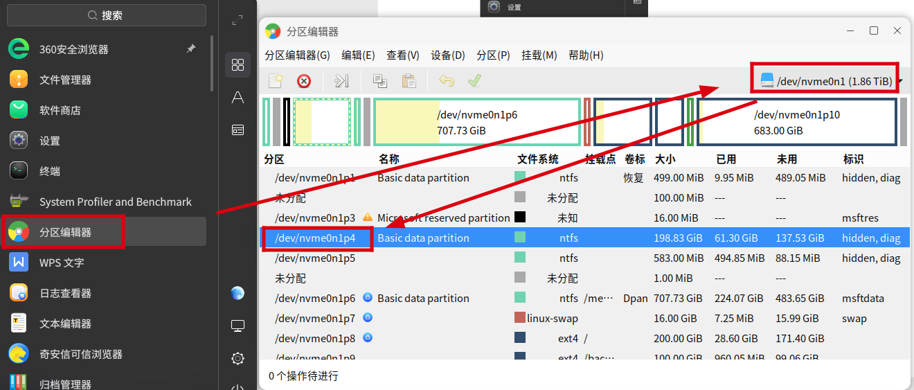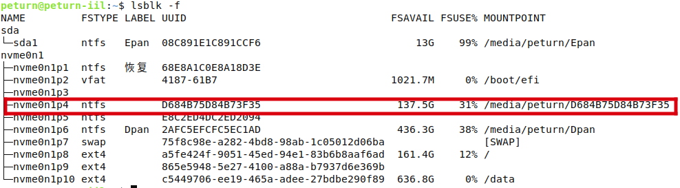 找到自己要屏避的对象,我的windows系统盘是nvme0n1p4,可以通过分区大小来确定,或者是进到盘里看看里面的文件和文件夹来判断和确定。
