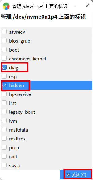 3、勾选“hidden”和“diag”选项,点击“关闭”!即可!