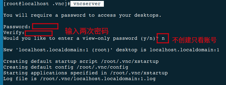 输入vncserver命令,进行vnc服务器的初始化,设置VNC访问密码需要输入两次,输入密码时不显示;提示是否创建只用于查看的密码,根据自己需要设置。如下图所示: