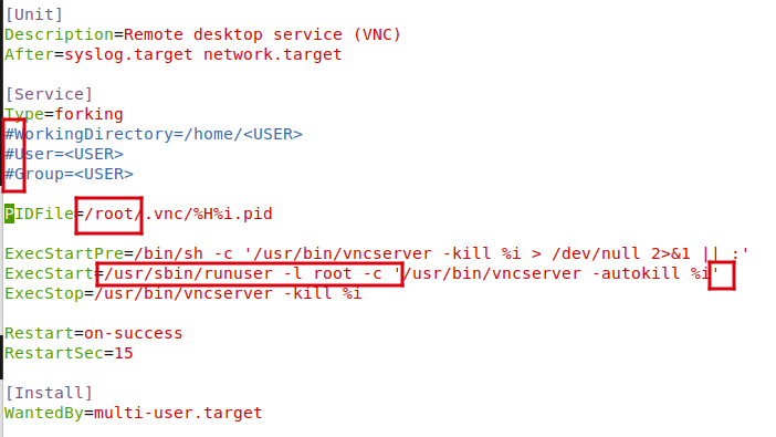 vim /etc/systemd/system/vncserver@:1.servicePIDFile=/root/.vnc/%H%i.pid ExecStartPre=/bin/sh -c '/usr/bin/vncserver -kill %i > /dev/null 2>&1 || :' ExecStart=/usr/sbin/runuser -l root -c '/usr/bin/vncserver -autokill %i' ExecStop=/usr/bin/vncserver -kill %i</td>如下图所示: