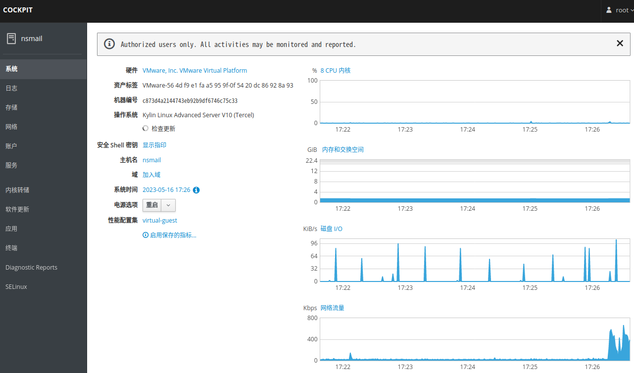 Cockpit是一款强大的Linux图形化监控工具,麒麟服务器操作系统默认安装,端口号是