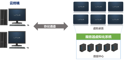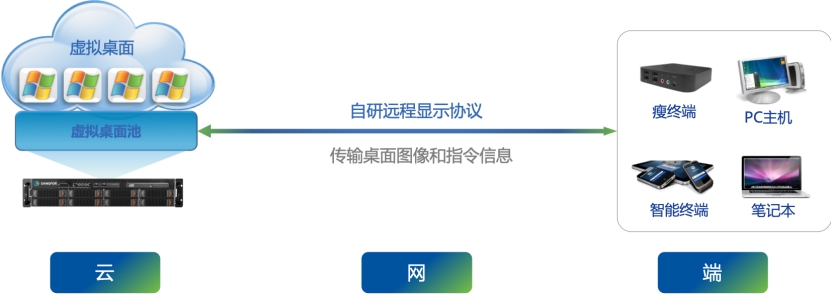 云终端与云桌面云一体机(VDS)中间通过安全高效桌面传输协议将云桌面/应用的图像、声音压缩加密,从VDS推送到云终端;同时将用户在云终端的鼠标、键盘事件的机械码加密发送回云中心,是用户与资源交互的桥梁。