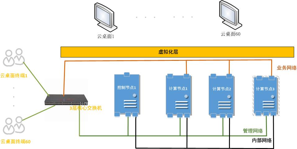 拓扑中桌面云服务器、集群交换机、虚拟桌面控制器、瘦终端均为新购设备。